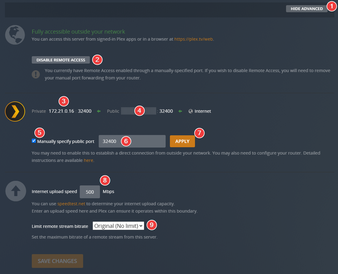 Applyand when everything is set up correctly, your Plex Media Server should be fully accessible outside of your network, so you can connect to your Plex server from outside. You may also need to configure port forwarding on your router. Detailed instructions are available HERE. - Enter your internet upload speed here and Plex can ensure it operates within this boundary.