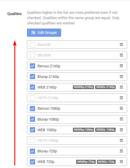 In the following screenshot, you will see a downgrade order of your Quality Sources where the highest Quality would be a WEB-720p and the lowest quality a Remux-2160p. As always, the upgrade order would be from bottom to top. (direction of the arrow)