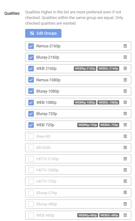 Qualities higher in the list are more preferred even if not checked. Qualities within the same group are equal. Only checked qualities are wanted.