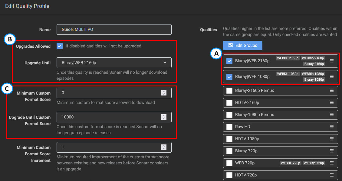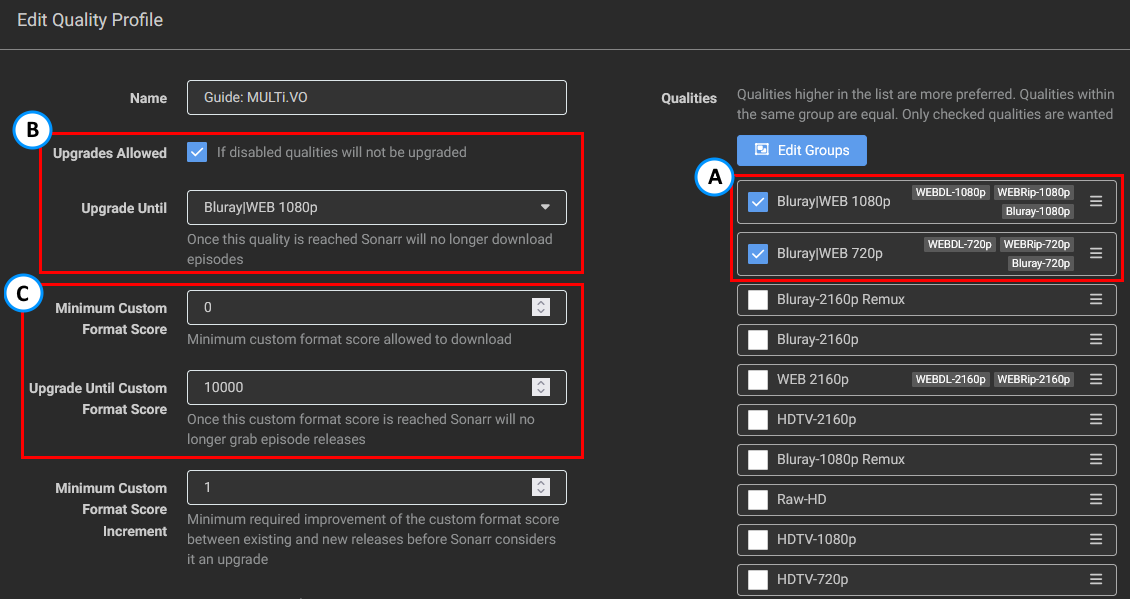 - Setting up a quality Profile to make use of the Custom Formats, as explained in How to setup Quality Profiles | Basics section.